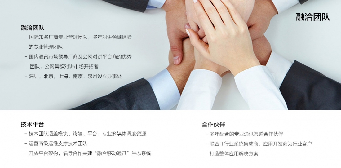 深圳融洽科技有限公司,是一家為企業(yè)客戶提供領(lǐng)先的寬窄帶融合移動(dòng)通信解決方案服務(wù)供應(yīng)商。融洽科技聚焦企業(yè)客戶內(nèi)部及對(duì)外溝通需求,自主研發(fā)融洽多媒體集群調(diào)度系統(tǒng),提供集群對(duì)講、音視頻調(diào)度、行業(yè)應(yīng)用等業(yè)務(wù),并整合公眾網(wǎng)絡(luò)對(duì)講及傳統(tǒng)專(zhuān)業(yè)對(duì)講優(yōu)勢(shì)資源,通過(guò)專(zhuān)業(yè)渠道、行業(yè)集成商、獨(dú)立軟件開(kāi)發(fā)商(ISV)為企業(yè)客戶提供優(yōu)質(zhì)的語(yǔ)音、圖像、視頻、及行業(yè)應(yīng)用等融合移動(dòng)通信解決方案。以極致用戶體驗(yàn)幫助客戶實(shí)現(xiàn)融洽溝通,提升團(tuán)隊(duì)工作成效,改善用戶服務(wù)質(zhì)量,增強(qiáng)企業(yè)競(jìng)爭(zhēng)力。