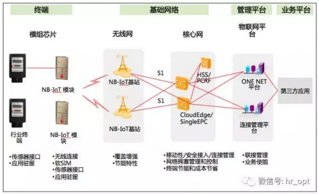②連接管理平臺:NB-IoT核心網設備(MME、SAEGW、HSS)通過IP承載網接入連接管理平臺,實現卡數據管理、連接信息查詢等功能。
