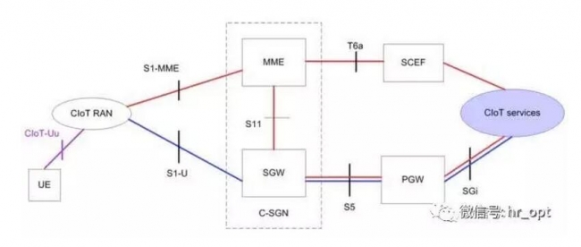 如上圖所示,紅線表示CIoT EPS控制面功能優(yōu)化方案,藍線表示CIoT EPS用戶面功能優(yōu)化方案。