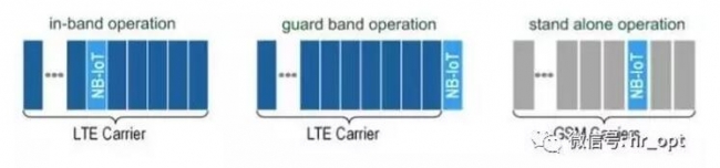 NB-IoT占用180KHz帶寬,這與在LTE幀結構中一個資源塊的帶寬是一樣的。所以,以下三種部署方式成為可能: