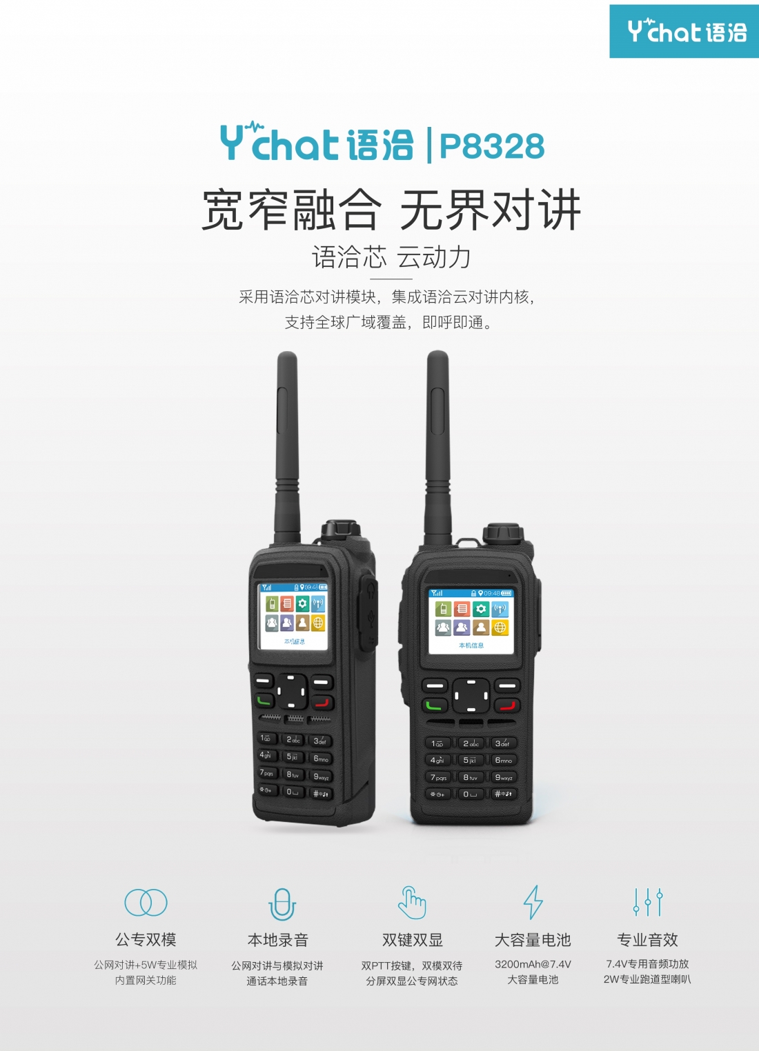 基于中國電信3G/2G網(wǎng)絡(luò) 語洽云對講與模擬對講兩種制式對講 5W模擬發(fā)射功率 1.77吋屏幕,語洽云對講與模擬對講在一個屏幕上進行呈現(xiàn) 支持語洽對講與模擬對講通話錄音 具有網(wǎng)關(guān)模式 3200mAh @7.4V大容量電池 ,電力持久