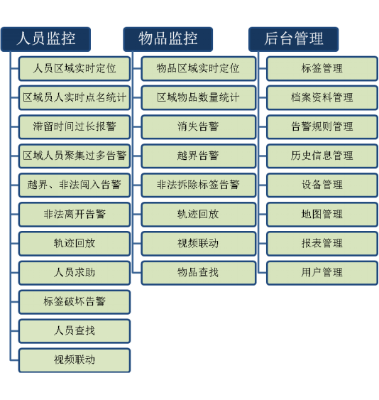 - 后臺(tái)管理:負(fù)責(zé)對(duì)設(shè)備管理,人員與物品跟標(biāo)簽的關(guān)聯(lián),人員、物品的檔案管理,定位區(qū)域管理,以及各種查詢統(tǒng)計(jì)等等。