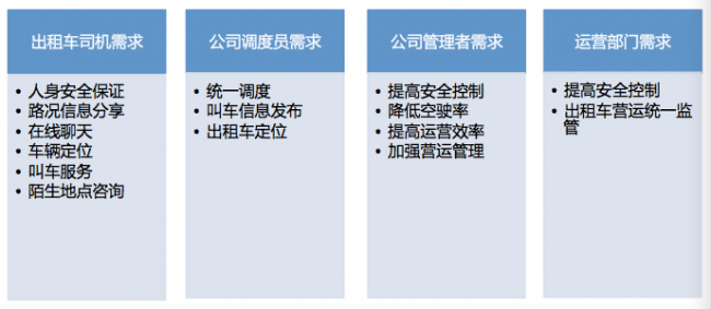 基于行業(yè)現(xiàn)狀,著重分析行業(yè)中各類角色的個(gè)性和共性特點(diǎn),出租車行業(yè)用戶的需求主要體現(xiàn)以下方面: